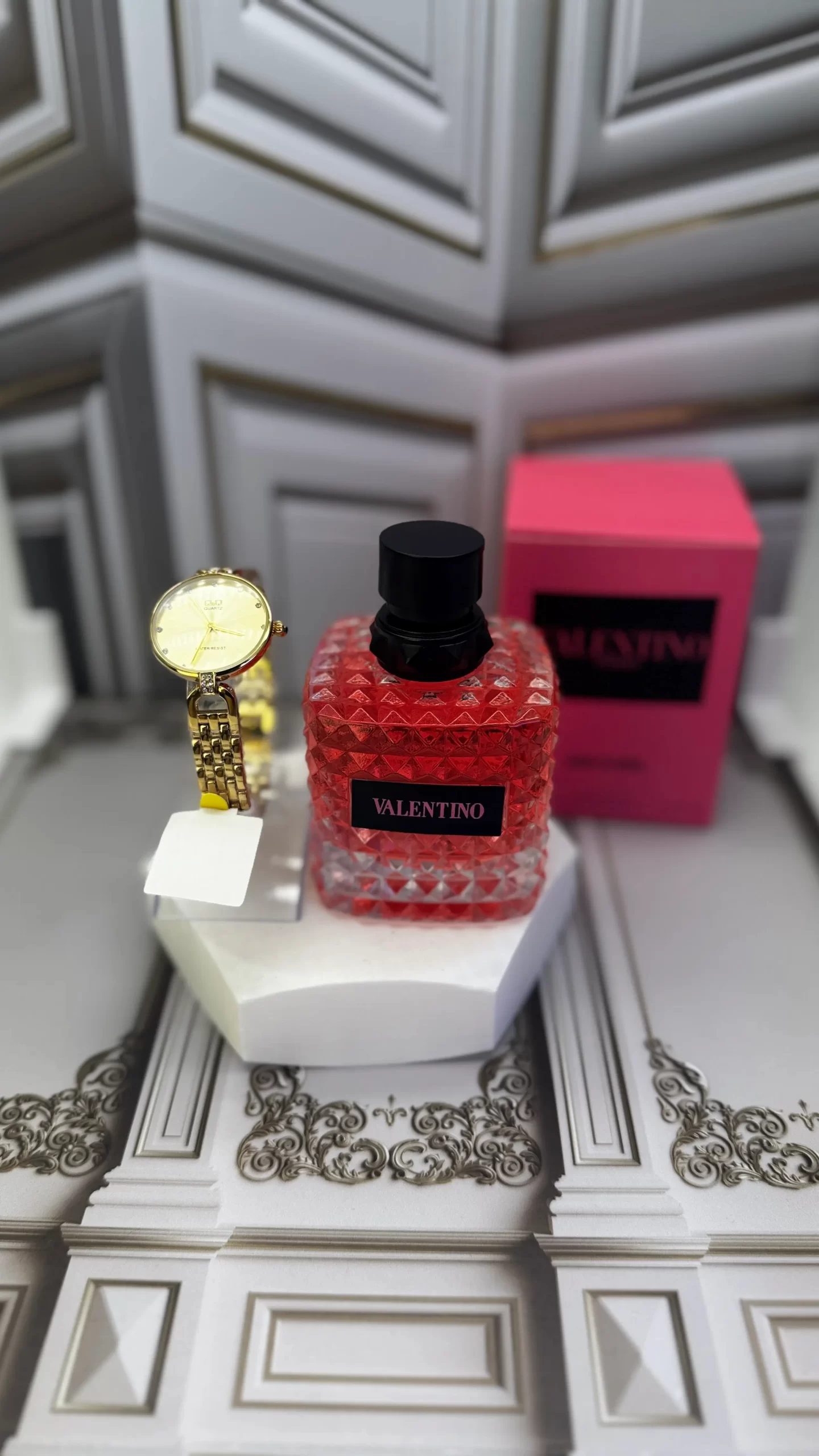 Set regalo que combina la sofisticación de un eau de parfum femenino moderno con la elegancia atemporal de un reloj metálico en acabado oro.